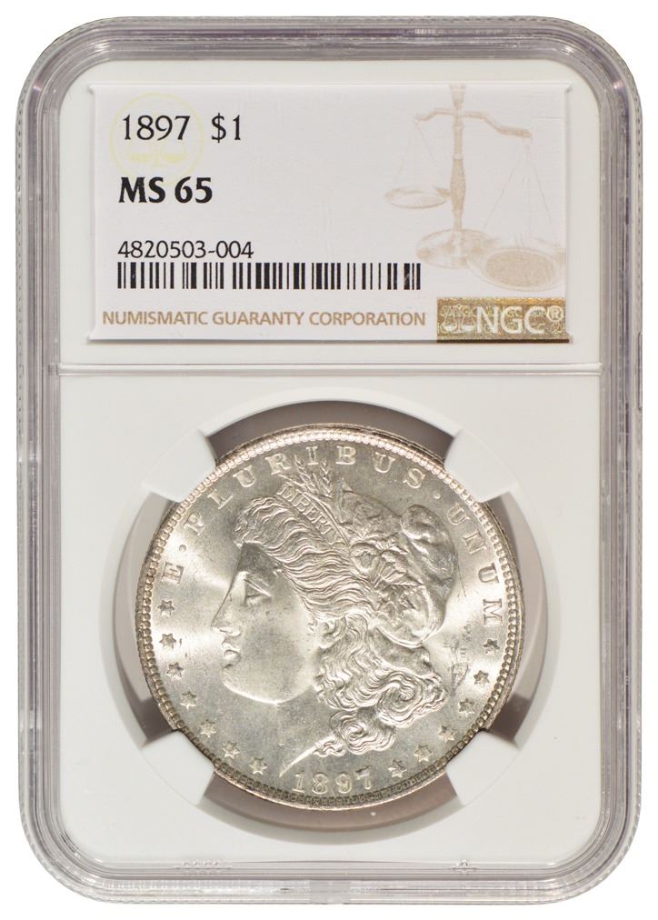 One 1897 $1 Morgan Silver Dollar Coin NGC MS65.