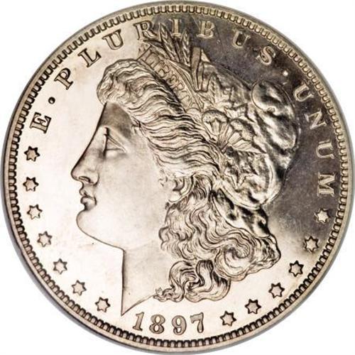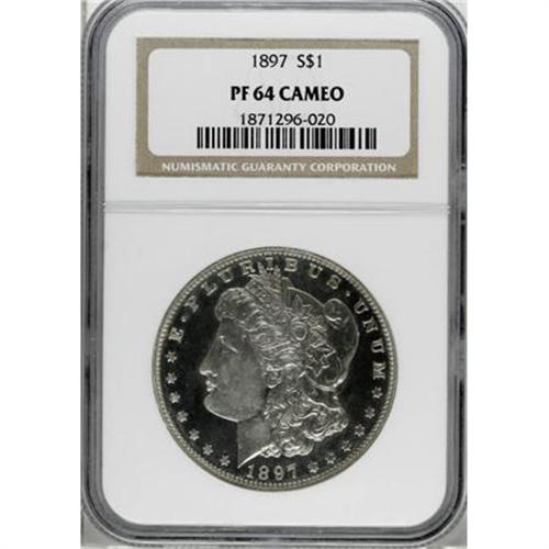 <B>1897 $1 PR64 Cameo NGC.</B></I> Mildly frosted motifs appear to ride over the mirrored fields of this near-Gem, and barely discernible wisps of color at the margins show up under magnification. A well executed strike leaves excellent delineation on the design elements. Some faint hairlines in the fields keep from full Gem.<BR><I>From The Queller Family Collection of Silver Dollars.</B></I><BR><BR><b>Shipping:</b> Coins & Currency (<a target="_blank" href="http://www.heritageauctions.com/common/shipping.php">view shipping information</a>)