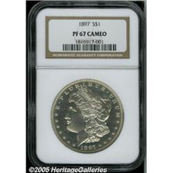 <B>1897<img border='0' src='http://www.heritagecoins.com/images/star.gif' width=10 height=10>$1 PR67 Cameo NGC.</B></I> This Superb Cameo Proof has deeply mirrored fields and lightly reflective devices. It is an outstanding example that will please the connoisseur. This example is sharply struck with fully brilliant silver surfaces that are entirely untoned.