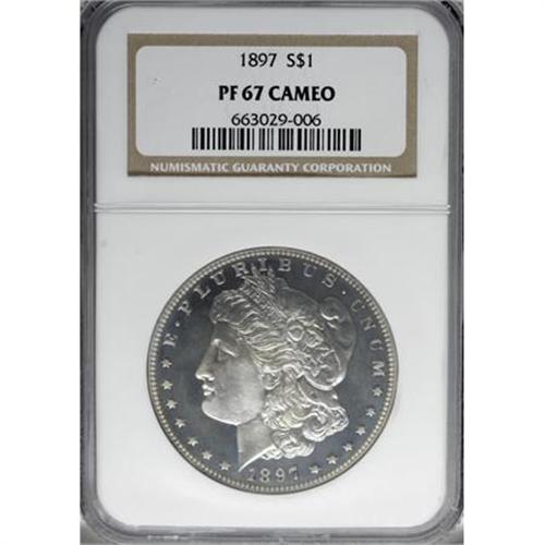 <B>1897 $1 PR67 Cameo NGC.</B></I> Delicate honey-gold and sky-blue tints enrich this imposing and unabraded Superb Gem. The strike is intricate, particularly on the eagle's breast and the hair above the ear. The impression is only incomplete on the left (facing) claw. The portrait, eagle, and wreath all offer consistent cameo frost, and the contrast with the glassy fields is undeniable. An outstanding representative of this highly popular crown-sized proof silver type. A scant 731 proofs were struck, few of which have survived in such exemplary condition. Census: 13 in 67 Cameo, 9 finer (10/07).<BR><I>From The Nick-A-Jack Collection.</B></I><BR><BR><b>Shipping:</b> Coins & Currency (<a target="_blank" href="http://www.heritageauctions.com/common/shipping.php">view shipping information</a>)