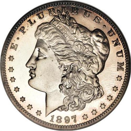 <B>1897 $1 PR67 NGC.</B></I> In 1897 the Philadelphia Mint coined 731 proof silver dollars, for sale to collectors as parts of sets, and individually as well. The number melted, if any, remains unknown. A brilliant Superb Gem proof with mostly bright silver at the centers of the obverse and reverse. Each side has pale lilac and rose toning at the borders. The design elements are bold, and the eye appeal is extraordinary. This piece is a full cameo proof, although not designated as such. Resubmission for a Cameo designation seems a worthwhile endeavor. Census: 15 in 67, 4 finer (1/08).<BR><I>From The Southwest Collection.</B></I><BR><BR><B>Coin Engraver:</B> George T. Morgan<BR><BR><b>Shipping:</b> Coins & Currency (<a target="_blank" href="http://www.heritageauctions.com/common/shipping.php">view shipping information</a>)
