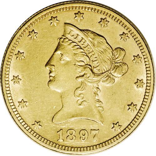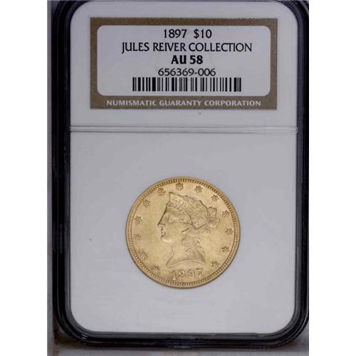 <B>1897<$10> AU58 NGC.</B></I> Light wear on the wingtips and Liberty's chin preclude a Mint State designation, but this bold example has a clean obverse and only a few inconspicuous marks beneath the left (facing) wing. Envelope Included.
