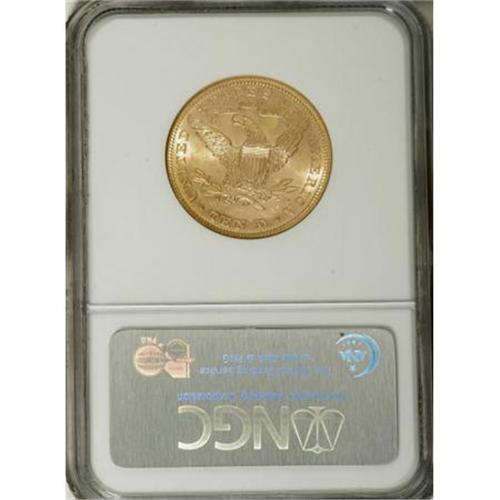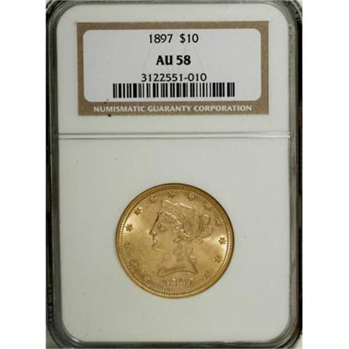 <B>1897 $10 AU58 NGC.</B></I> NGC Census: (121/6251). PCGS Population (241/3468). Mintage: 1,000,159. Numismedia Wsl. Price for NGC/PCGS coin in AU58: $379. (#8737)<BR><BR><B>Coin Engraver:</B> Christian Gobrecht<BR><BR><b>Shipping:</b> Coins & Currency (<a target="_blank" href="http://www.heritageauctions.com/common/shipping.php">view shipping information</a>)