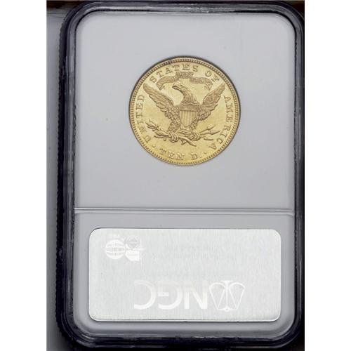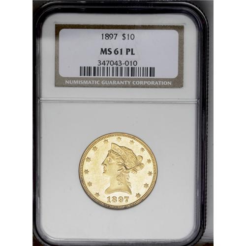 <B>1897<$10> MS61 Prooflike NGC.</B></I> The lightly frosted portrait contrasts with the flashy obverse field. The reverse is also moderately reflective. Attenuated detail on the tail feathers and neck curls confirms die polishing. Census: 5 in 61 Prooflike, 5 finer (5/06).