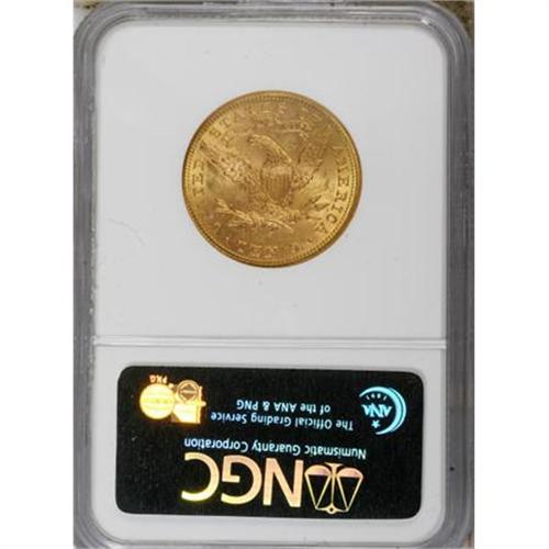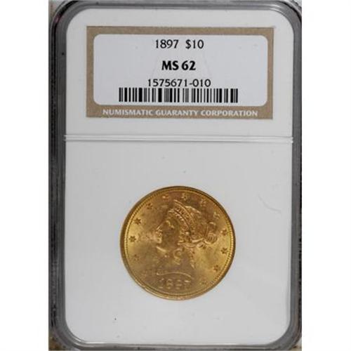 <B>1897 $10 MS62 NGC.</B></I> NGC Census: (2438/1038). PCGS Population (1391/462). Mintage: 1,000,159. Numismedia Wsl. Price for NGC/PCGS coin in MS62: $380. (#8737)<BR><BR><B>Coin Engraver:</B> Christian Gobrecht<BR><BR><b>Shipping:</b> Coins & Currency (<a target="_blank" href="http://www.heritageauctions.com/common/shipping.php">view shipping information</a>)