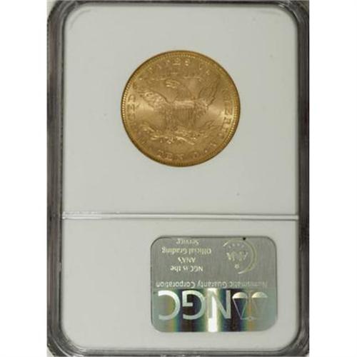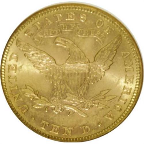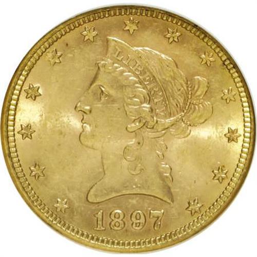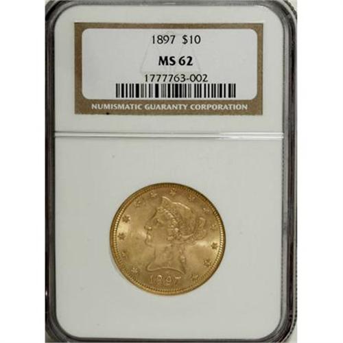 <B>1897 $10 MS62 NGC.</B></I> NGC Census: (2456/1045). PCGS Population (1411/469). Mintage: 1,000,159. Numismedia Wsl. Price for NGC/PCGS coin in MS62: $395. (#8737)<BR><BR><B>Coin Engraver:</B> Christian Gobrecht<BR><BR><b>Shipping:</b> Coins & Currency (<a target="_blank" href="http://www.heritageauctions.com/common/shipping.php">view shipping information</a>)