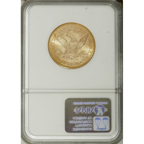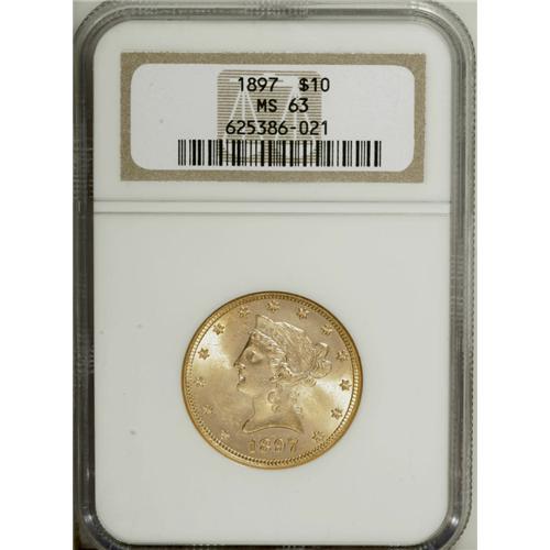 <B>1897 $10 MS63 NGC.</B></I> Flashy yellow-gold surfaces imbued with hints of orange and tan jump out at the viewer, and sharply impressed design elements further enhance the coin's eye appeal. An even higher grade is precluded by some minute marks.<BR><BR><b>Shipping:</b> Coin/Currency (<a target="_blank" href="http://www.heritageauctions.com/common/shipping.php">view shipping information</a>)