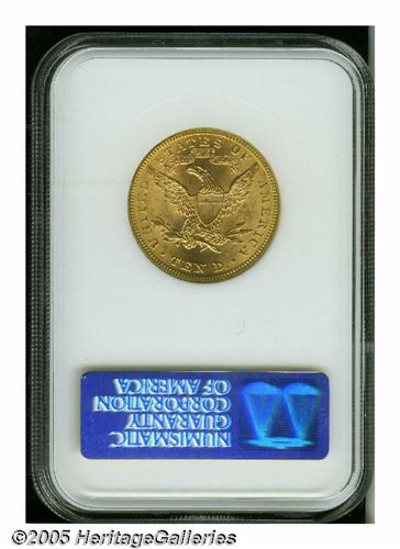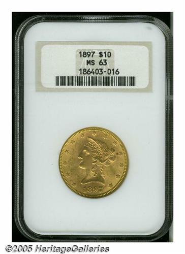 <B>1897<$10> MS63 NGC.</B></I> Impressive for the numerical grade, this lustrous and crisply struck available date Eagle has a small alloy spot near star 10 but is otherwise high end.<BR><I>From the Dr. Kurt Peters Collection.</B></I> From the Dr. Kurt Peters Collection.