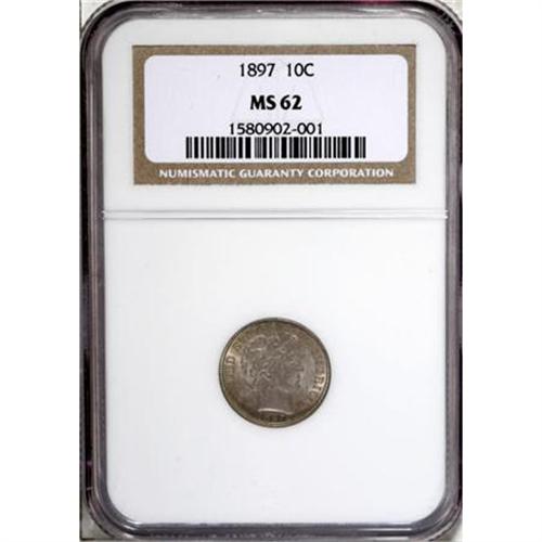 <B>1897 10C MS62 NGC.</B></I> NGC Census: (41/227). PCGS Population (53/199). Mintage: 10,869,264. Numismedia Wsl. Price for NGC/PCGS coin in MS62: $138. (#4812)<BR><BR><B>Coin Engraver:</B> Charles E. Barber<BR><BR><b>Shipping:</b> Coins & Currency (<a target="_blank" href="http://www.heritageauctions.com/common/shipping.php">view shipping information</a>\)