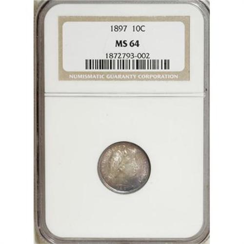 <B>1897 10C MS64 NGC.</B></I> . NGC Census: (103/72). PCGS Population (74/66). Mintage: 10,869,264. Numismedia Wsl. Price for NGC/PCGS coin in MS64: $260. (#4812)<BR><BR><B>Coin Engraver:</B> Charles E. Barber<BR><BR><b>Shipping:</b> Coins & Currency (<a target="_blank" href="http://www.heritageauctions.com/common/shipping.php">view shipping information</a>)