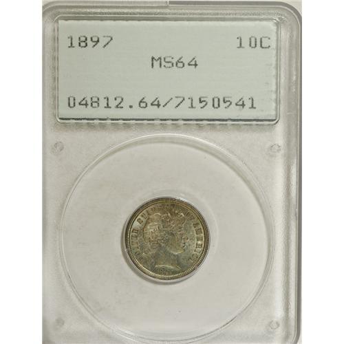 <B>1897 10C MS64 PCGS.</B></I> PCGS Population (67/55). NGC Census: (99/72). Mintage: 10,869,264. Numismedia Wsl. Price for NGC/PCGS coin in MS64: $252. (#4812)<BR><BR><b>Shipping:</b> Coins & Currency (<a target="_blank" href="http://www.heritageauctions.com/common/shipping.php">view shipping information</a>)