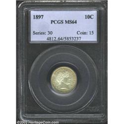 1897 10C MS64 PCGS. This frosty textured, slate-gray colored survivor is possessed of razor sharp striking detail. There are no distracting abrasions, a tiny spot in the reverse field below the denomination is noted.From the Ronald Bozarth Collection. Important notice: We expect to be auctioning lots at the rate of 200-250 per hour. Sometimes eBay Premier live bid software cannot keep up with that pace, so we strongly recommend that you place a realistic proxy bid now as insurance to avoid disappointment. Also please note that all Heritage/CAA lots purchased through eBay Premier carry a 20% Buyer's Premium. Please make sure you read the Terms and Conditions.
