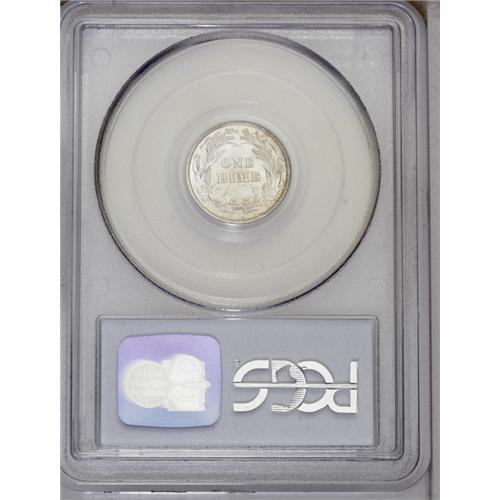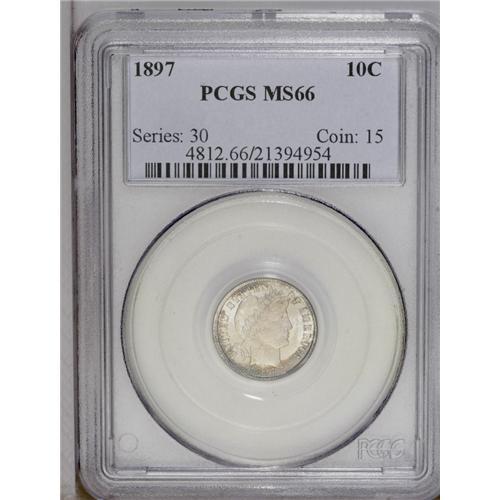 <B>1897<10C> MS66 PCGS.</B></I> Wonderfully original with a bright silver-golden reverse and a silver-gray obverse with dark-green and maroon peripheral highlights. The strike is bold and the only noticeable flaws are three tiny ticks on Liberty's face and nose. Population: 17 in 66, 4 finer (1/06).