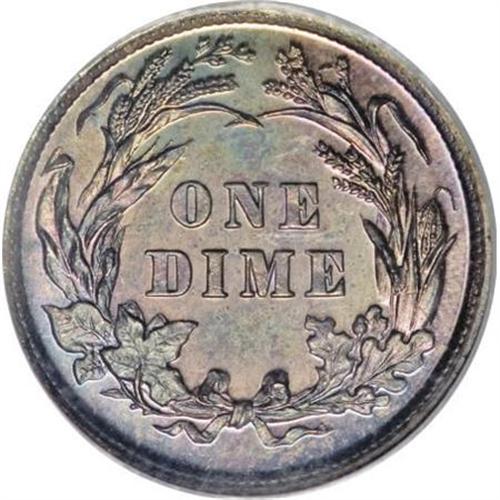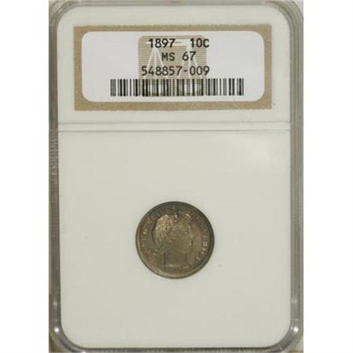 <B>1897 10C MS67 NGC.</B></I> Whispers of cobalt-blue, rose, and apple-green bathe the obverse, while the reverse is primarily lilac and powder-blue. A powerful strike manifests itself in sharp delineation on the design elements, with no areas revealing hints of softness. Close examination shows no significant marks. This Superb Gem ranks among the finest certified. Census: 5 in 67, 0 finer (8/07).<BR><BR><B>Coin Engraver:</B> Charles E. Barber<BR><BR><b>Shipping:</b> Coins & Currency (<a target="_blank" href="http://www.heritageauctions.com/common/shipping.php">view shipping information</a>)