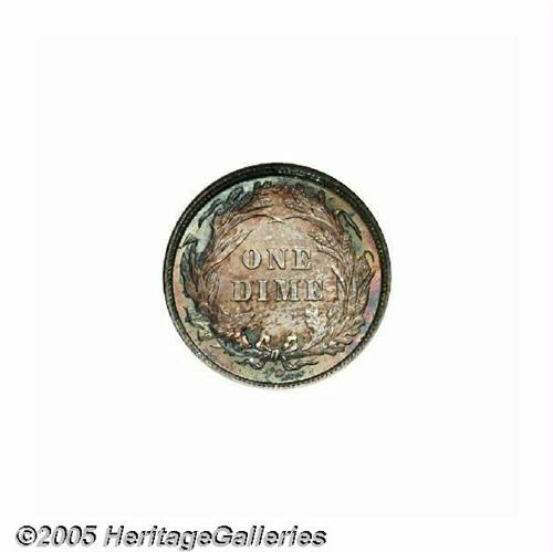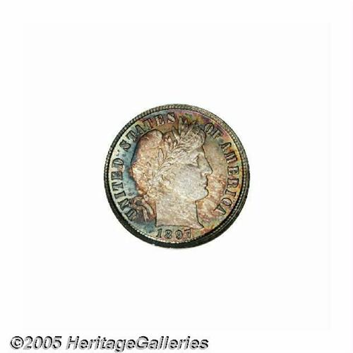 <B>1897<10C> MS67 <S NGC.</B></I> A spectacular Superb Gem example that ranks near the apex of the surviving population both technically and aesthetically. The surfaces are frosty and most design features are boldly and deeply defined. The central areas exhibit intermingled golden brown and lilac toning; electric blue ornaments the rims. This specimen was given a star designation by NGC signifying outstanding quality for the grade. Tied as the finest example certified by either of the major services. Population: 2 in 67 <S, 0 finer (6/05).