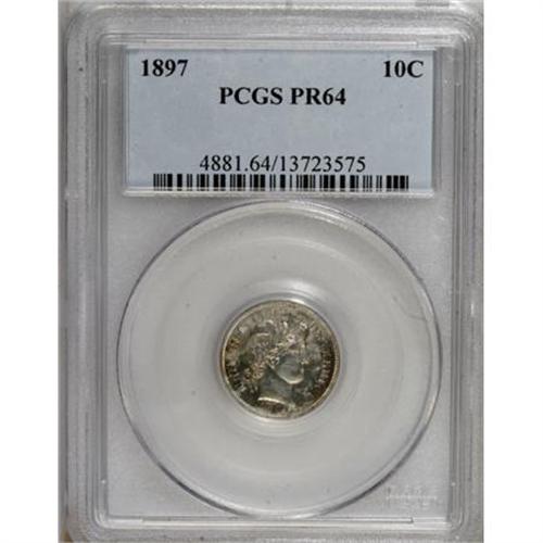 <B>1897 10C PR64 PCGS.</B></I> PCGS Population (53/86). NGC Census: (38/86). Mintage: 731. Numismedia Wsl. Price for NGC/PCGS coin in PR64: $585. (#4881)<BR><BR><B>Coin Engraver:</B> Charles E. Barber<BR><BR><b>Shipping:</b> Coins & Currency (<a target="_blank" href="http://www.heritageauctions.com/common/shipping.php">view shipping information</a>)