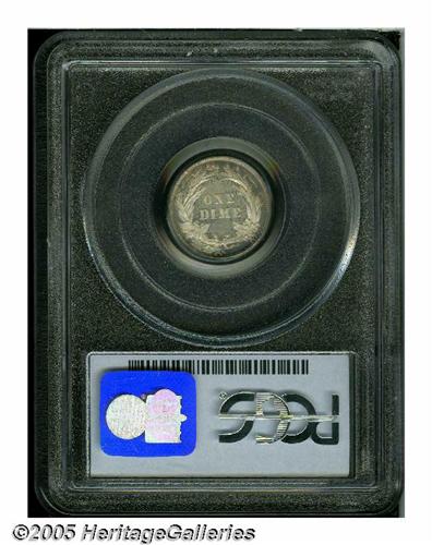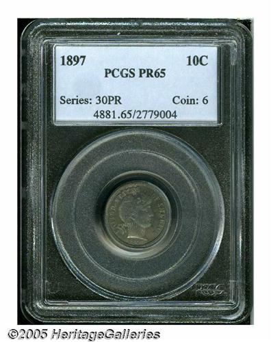 <B>1897<10C> PR65 PCGS.</B></I> The obverse of this razor sharp Gem is engulfed in deep steel-blue and gunmetal toning, while a smattering of milky patina is focused on the center of the reverse. Population: 44 in 65, 45 finer (4/05).<BR><I>From The Western Hills Collection.</B></I>