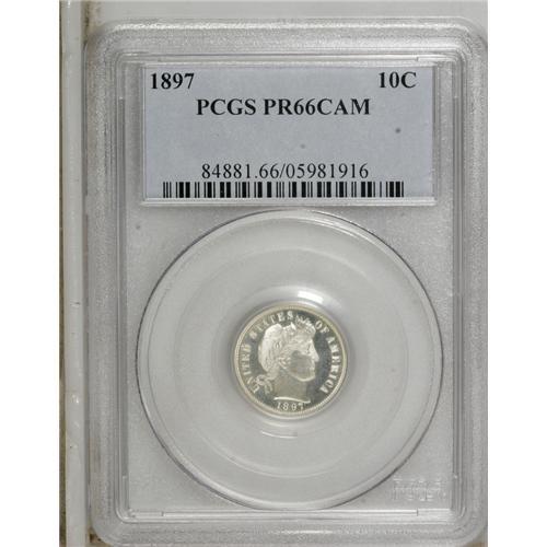 <B>1897 10C PR66 Cameo PCGS.</B></I> Ice-white motifs contrast with the remarkably smooth mirrored fields. Brilliant aside from a tan fleck on Liberty's jaw. A mere 731 proofs were struck. Population: 10 in 66 Cameo, 10 finer (2/07).<BR><BR><b>Shipping:</b> Coins & Currency (<a target="_blank" href="http://www.heritageauctions.com/common/shipping.php">view shipping information</a>)