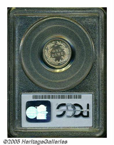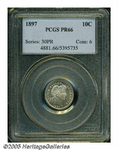 <B>1897<10C> PR66 PCGS.</B></I> Lightly toned in tan and plum colors, the devices exhibit noticeable frost and approach a Cameo designation, which PCGS has not seen fit to bestow. Outstanding quality for this low mintage proof date, a stingy 731 pieces issued. Population: 27 in 66, 18 finer (5/05).