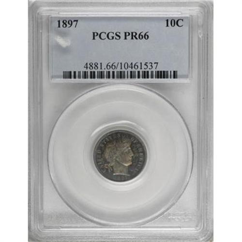 <B>1897 10C PR66 PCGS.</B></I> The dusky green-gold and turquoise patina that graces both sides of this earlier Barber proof dime is thin enough to show the coin's excellent reflectivity. Sharply struck with great eye appeal. Population: 28 in 66, 16 finer (8/07).<BR><BR><B>Coin Engraver:</B> Charles E. Barber<BR><BR><b>Shipping:</b> Coins & Currency (<a target="_blank" href="http://www.heritageauctions.com/common/shipping.php">view shipping information</a>)
