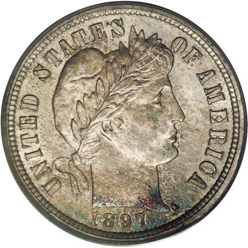 <B>1897<10C> PR67 PCGS.</B></I> Ex: Law Collection. Deeply toned in attractive shades of sea-green and lilac-gray in a somewhat variegated fashion over each side. A beautiful type coin with virtually flawless surfaces and a full, sharp strike. One of only 731 proofs coined this year. Population: 16 in 67, 3 finer (3/06).