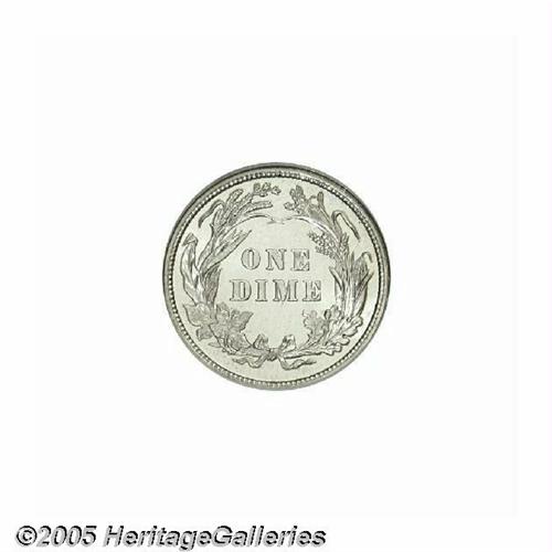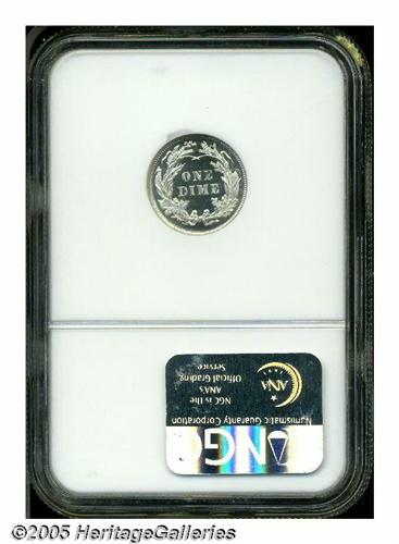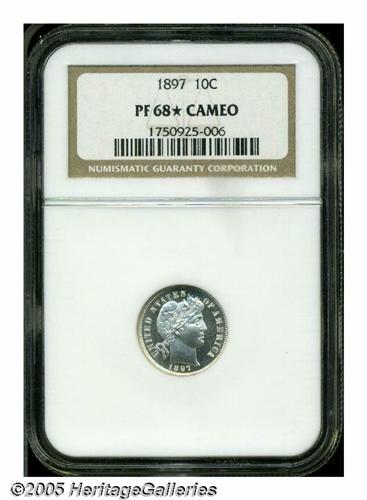 <B>1897<10C> PR68 <S Cameo NGC.</B></I> An early proof issue in this turn-of-the-century Dime series, the otherwise easily obtainable 1897 is not well represented in today's market at the PR68 level of preservation. In addition to smooth, pristine surfaces, this virtually untoned example is possessed of bold cameo contrast that only enhances the eye appeal. There are no ill-defined features, and no mentionable disruptions to the silky-smooth sheen of this marvelous Superb Gem. Population: 2 in 68 <S, 0 finer (6/05).