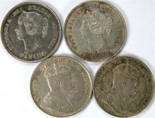 Canada Five Cents 1897, 1900 Oval 00, 1902H Small H and 1904, all EF and pale to lightly toned