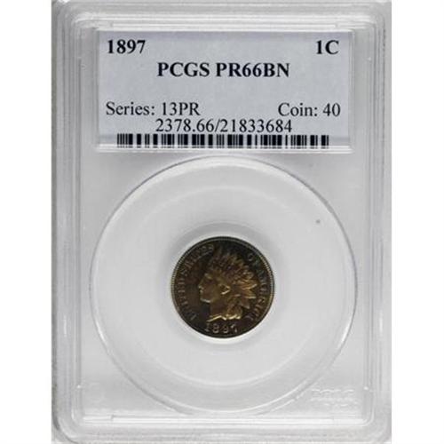 <B>1897 1C PR66 Brown PCGS.</B></I> PCGS Population (10/1). NGC Census: (15/1). Mintage: 1,938. Numismedia Wsl. Price for NGC/PCGS coin in PR66: $372. (#2378)<BR><BR><B>Coin Engraver:</B> James B. Longacre<BR><BR><b>Shipping:</b> Coins & Currency (<a target="_blank" href="http://www.heritageauctions.com/common/shipping.php">view shipping information</a>\)