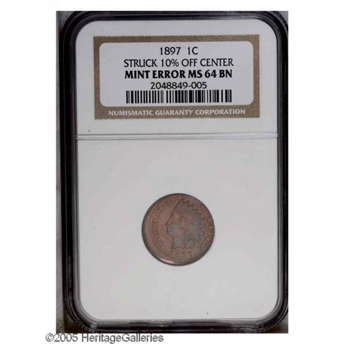 1897 1C Indian Cent--Struck 10% Off Center--MS64 Brown 1897[1C] Indian Cent--Struck 10% Off Center--
