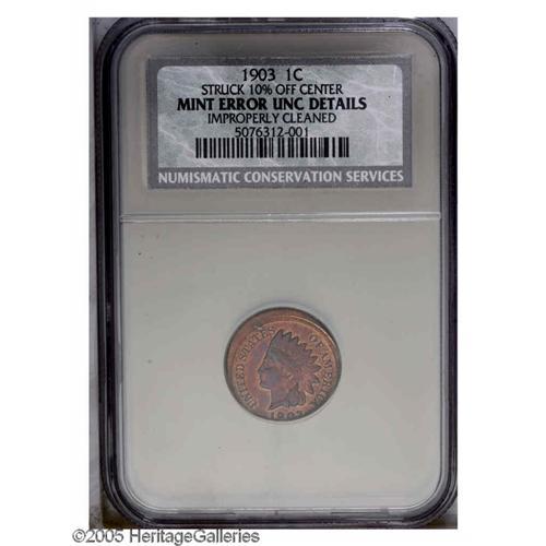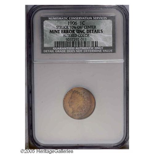 <B>1897<1C> Indian Cent--Struck 10% Off Center--MS64 Brown NGC,</B></I> off center toward 2 o'clock, orange-red and cobalt-blue colors; <B>1903 Indian Cent--Struck 10% Off Center, Improperly Cleaned--NCS, Unc. Details,</B></I> off center toward 5:30 but the date is mostly intact, lustrous violet and rose-red color; and a <B>1906 Indian Cent--Struck 10% Off Center, Altered Color--NCS, Unc. Details,</B></I> off center toward 9 o'clock, dubious orange, aqua, and ruby tones, the 1 in the date is lightly repunched at the base.