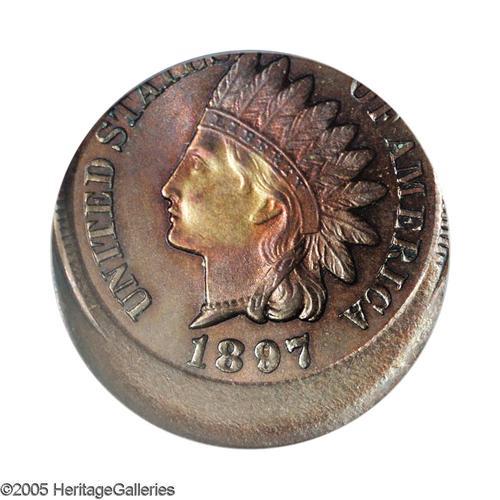 <B>1897<1C> Indian Cent--Struck 20% Off Center--MS63 Brown PCGS.</B></I> Struck prominently off center toward 12 o'clock. The tip of the highest headdress feather is off the flan, along with portions of STATES OF and the bottom edge of the wreath. This boldly struck piece has unbroken cartwheel sheen and deep violet, gold, lime, and olive-brown colors. For both the error enthusiast and the toning fan, this coin presents a rare opportunity.<BR><I>From The Larry Rausch Collection of Errors, Part Seven.</B></I>