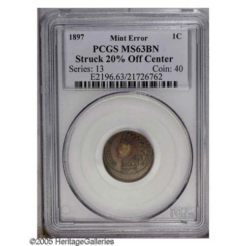 1897 1C Indian Cent--Struck 20% Off Center--MS63 Brown 1897[1C] Indian Cent--Struck 20% Off Center--