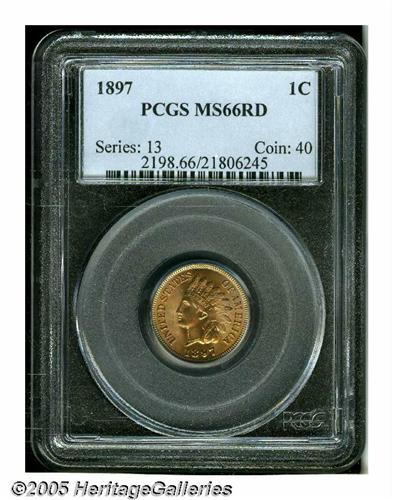 <B>1897<1C> MS66 Red PCGS.</B></I> Highly lustrous with copper-gold patination and well struck motifs. A few flyspecks are noted on each side, but there are no contact marks of note, save for a single tiny nick on Liberty's upper cheekbone, directly below her temple. Extremely scarce at this lofty grade level, and virtually unobtainable any finer. Population: 12 in 66 Red, 1 finer (6/05).