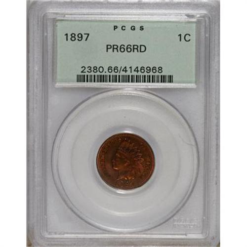 <B>1897 1C PR66 Red PCGS.</B></I> This intricately struck crimson-orange proof is every bit the Premium Gem. The surfaces are mark-free and exhibit only minimal carbon. A lovely survivor that should see spirited bidding among advanced specialists. Certified in a green label holder. Population: 6 in 66 Red, 6 finer (4/07).<BR><I>Ex: Joseph P. Gorrell Collection (Heritage, 1/03), lot 4515.</B></I><BR><BR><b>Shipping:</b> Coins & Currency (<a target="_blank" href="http://www.heritageauctions.com/common/shipping.php">view shipping information</a>)