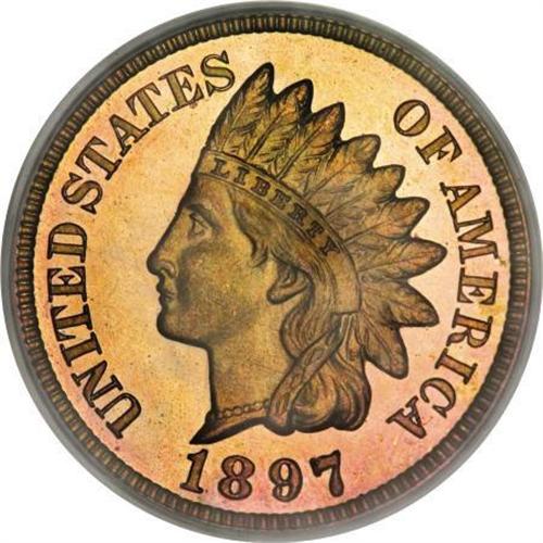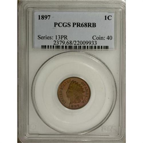 <B>1897 1C PR68 Red and Brown PCGS.</B></I> Beautiful cherry-red and mint-green shadings visit the copper-orange surfaces of this magnificent specimen. The fields are watery and deeply reflective, and the design elements offer razor-sharp definition. A small flaw on the neck is trivial. This is an incredible condition rarity, one of just two pieces for the date certified by PCGS as PR68 with any color classification; the other is listed as Cameo, but surface information is not included (11/07).<BR> With a mintage of 1,938 pieces, the 1897 proof issue has a middle-of-the-road mintage by the standards of late-date Indian cent issues, though finding an attractive specimen can pose a challenge. The interested collector is invited to inspect this assuredly appealing exemplar.<BR><I>From The New York Eye Appeal Collection, Part Three.</B></I><BR><BR><B>Coin Engraver:</B> James B. Longacre<BR><BR><b>Shipping:</b> Coins & Currency (<a target="_blank" href="http://www.heritageauctions.com/common/shipping.php">view shipping information</a>)