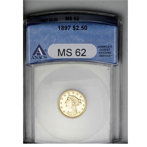 <B>1897<$2 1/2> MS62 ANACS.</B></I> Lustrous and well struck with straw-gold color and scattered minor contact marks that determine the grade.