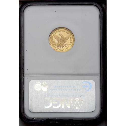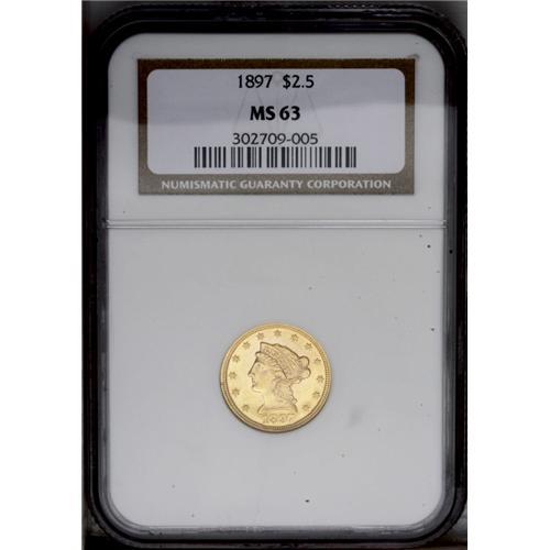 <B>1897<$2 1/2> MS63 NGC.</B></I> This lower mintage quarter eagle provides bright lustrous surfaces, and is only limited in grade by a tiny rim nick at 9 o'clock. <BR><BR><B>Important notice:</B> Heritage usually auctions material at the rate of 200-250 lots per hour. On some occasions eBay Live bid software or the Internet may not be able to keep up with the pace of the auction. We recommend placing a realistic absentee bid now as insurance to avoid disappointment. Occasionally the auctioneer may eliminate or reject an eBay Live bid, and the auctioneer may also reopen a lot after the close of the eBay live bidding (usually because we missed an audience bid), and may reject your bid even if it shows you as the winning bidder. By bidding via eBay Live, you agree that Heritage may award the lot to another bidder at its sole discretion under the circumstances described above or any other reasonable circumstances. Since eBay bids are not shown to us until we open the lot on the floor, we treat those bids just like floor bids. In most cases the floor responds before the eBay bid is presented to us, due to Internet lag time, so for consistency we have made it a policy that floor bids are always considered first over tie eBay live bids. Also please note that all Heritage lots purchased through eBay Live carry a 20% Buyer's Premium. Please make sure you read the Terms and Conditions before you bid. This lot is being auctioned in conjunction with a live floor auction by Heritage Galleries & Auctioneers. All final auction and invoice information will be supplied by Heritage Galleries & Auctioneers, and all other information should be considered preliminary. Lot:2447 <BR><BR><B>Winning Notification and Billing:</B> After the FINAL session in this auction is complete, Heritage will send e-mail and snail mail invoices. This process normally takes several days. All final auction and invoice information will be supplied by Heritage Galleries & Auctioneers, and all other information should be considered preliminary. <BR><BR>This auction will be conducted on a live auction floor and over the Internet through eBay Live. If you choose to place an absentee bid, please take a moment to <font color='#0000ff'><u><a href='http://pages.ebay.com/liveauctions/help/before/laabsentee.html'>learn how eBay Live absentee bidding works</a></u></font><font color='#000000'>