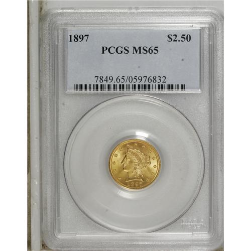 <B>1897 $2 1/2 MS65 PCGS.</B></I> Solidly struck with interesting apricot tinges against a backdrop of yellow-gold. The luster is strong, and the clean surfaces are befitting of the Gem grade. Population: 55 in 65, 24 finer (1/07).<BR><BR><b>Shipping:</b> Coins & Currency (<a target="_blank" href="http://www.heritageauctions.com/common/shipping.php">view shipping information</a>)