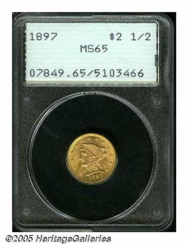 <B>1897<$2 1/2> MS65 PCGS.</B></I> The 1897 is one of many underappreciated low mintage dates within the long-lived Liberty Quarter Eagle series. A lustrous, needle-sharp, and gorgeously preserved Gem that has original apricot centers bounded by lime hues. Housed in an older generation holder. Population: 50 in 65, 24 finer (5/05).