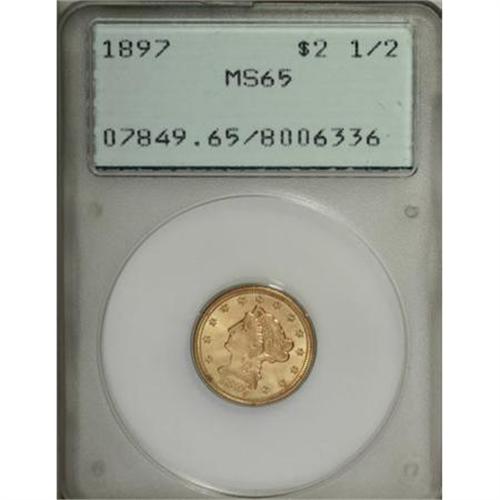<B>1897 $2 1/2 MS65 PCGS.</B></I> This gorgeous Gem has an exemplary strike and undisturbed fields. The subtle lime-gold and orange toning is blatantly original. Certified in a first generation holder. One of only 29,768 pieces struck.<BR><BR><B>Coin Engraver:</B> Christian Gobrecht<BR><BR><b>Shipping:</b> Coins & Currency (<a target="_blank" href="http://www.heritageauctions.com/common/shipping.php">view shipping information</a>)