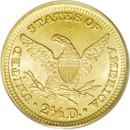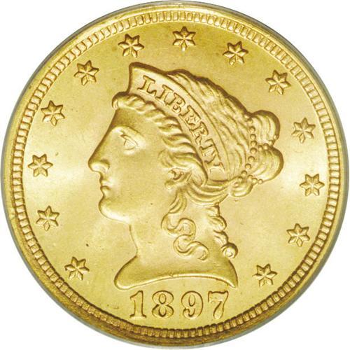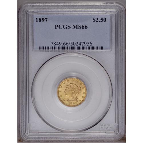 <B>1897<$2 1/2> MS66 PCGS.</B></I> A Superb example of this later date issue that has a surprisingly low mintage of only 29,904 pieces. Fully struck throughout, the surfaces display rich, satiny luster and the color is unquestionably original with a rich, greenish cast on each side. A wonderful coin for type purposes. Population: 19 in 66, 4 finer (1/06).
