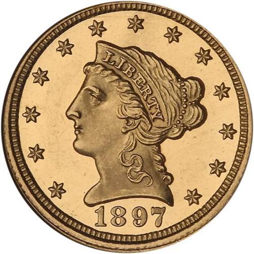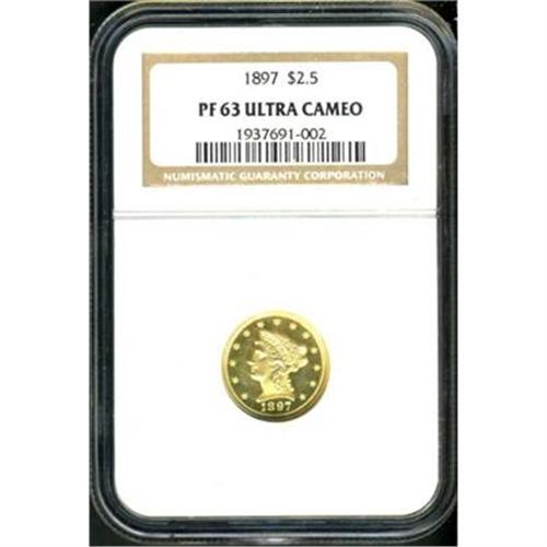 <b>1897 $2.50 Liberty. NGC graded PF63 UC.</b> Pop: 3/21. Proof 1897 quarter eagles are from an original mintage of 136 pieces. Boldly cameoed, both sides of this choice piece coalesce into a cameo compromise between the deeply reflective fields and smooth-frosted devices to present high quality aesthetic appeal. Scattered grade-limiting hairlines are present on either sides. But these are so slight that they almost allow the coin to run into the Proof 64 category. With this firmly in mind when bidding, the collector to whom a sudden ray of light reveals the fact will become the proud next owner.