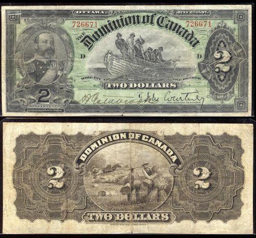 1897 $2 DC-14b, Fine. A solid example with full colour and even margins. Very light nick bottom middle portion of note. Another nice Dominion example.