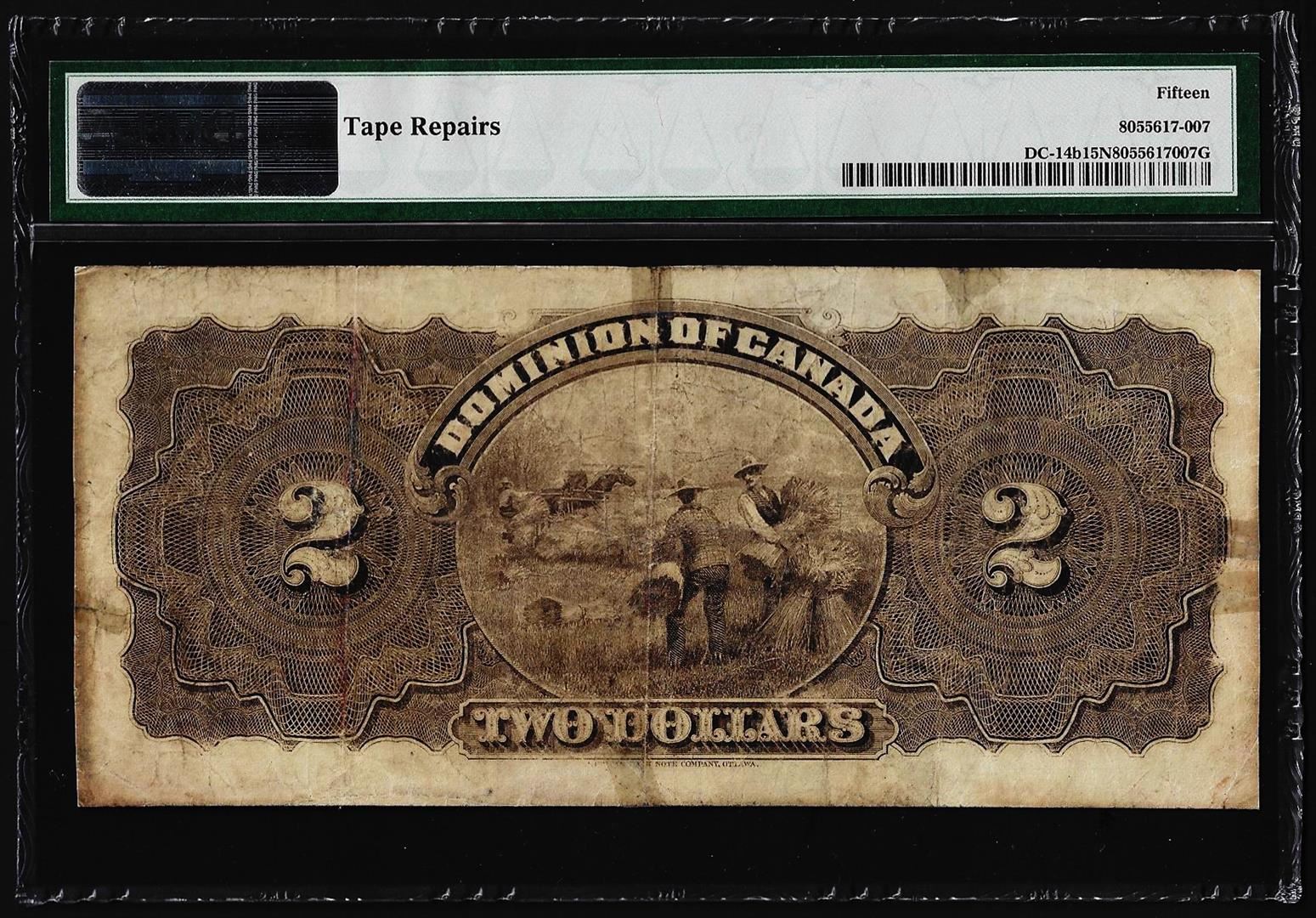 One 1897 $2 Dominion of Canada Note DC-14b PMG Choice Fine 15 Net. PMG Certified.