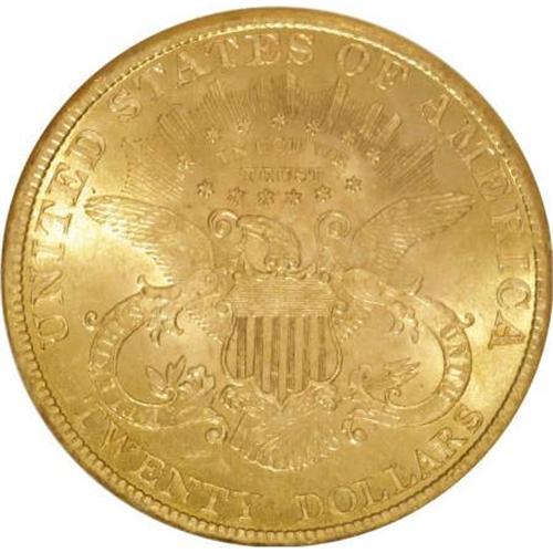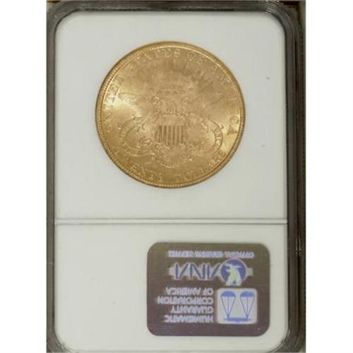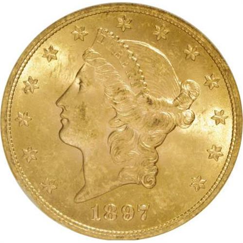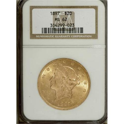 <B>1897 $20 MS62 NGC.</B></I> NGC Census: (5444/2413). PCGS Population (3560/1242). Mintage: 1,383,261. Numismedia Wsl. Price for NGC/PCGS coin in MS62: $740. (#9031)<BR><BR><B>Coin Engraver:</B> James B. Longacre<BR><BR><b>Shipping:</b> Coins & Currency (<a target="_blank" href="http://www.heritageauctions.com/common/shipping.php">view shipping information</a>)