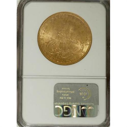 <B>1897 $20 MS62 NGC.</B></I> The base of the 8 is repunched. A lustrous green-gold Type Three twenty with the usual number of faint grazes for the MS62 level.<BR><BR><B>Coin Engraver:</B> James B. Longacre<BR><BR><b>Shipping:</b> Coins & Currency (<a target="_blank" href="http://www.heritageauctions.com/common/shipping.php">view shipping information</a>)