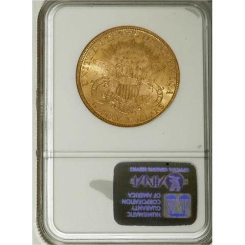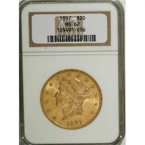 <B>1897 $20 MS62 NGC.</B></I> NGC Census: (5556/2453). PCGS Population (3679/1307). Mintage: 1,383,261. Numismedia Wsl. Price for NGC/PCGS coin in MS62: $925. (#9031)<BR><BR><B>Coin Engraver:</B> James B. Longacre<BR><BR><b>Shipping:</b> Coins & Currency (<a target="_blank" href="http://www.heritageauctions.com/common/shipping.php">view shipping information</a>)