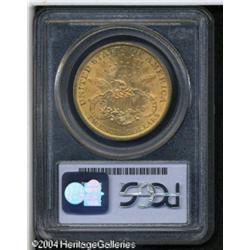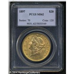 1897 $20 MS62 PCGS. A meticulously struck honey-go <B>1897 $20 MS62 PCGS.</B></I> A meticulously struck honey-gold piece that has the expected minor luster grazes, but there are no distracting bagmarks. <BR><BR><B>Important notice:</B> Heritage usually auctions material at the rate of 200-250 lots per hour. On some occasions eBay Live bid software or the Internet may not be able to keep up with the pace of the auction. We recommend placing a realistic absentee bid now as insurance to avoid disappointment. Occasionally the auctioneer may eliminate or reject an eBay Live bid, and the auctioneer may also reopen a lot after the close of the eBay live bidding (usually because we missed an audience bid), and may reject your bid even if it shows you as the winning bidder. By bidding via eBay Live, you agree that Heritage may award the lot to another bidder at its sole discretion under the circumstances described above or any other reasonable circumstances. Since eBay bids are not shown to us until we open the lot on the floor, we treat those bids just like floor bids. In most cases the floor responds before the eBay bid is presented to us, due to Internet lag time, so for consistency we have made it a policy that floor bids are always considered first over tie eBay live bids. Also please note that all Heritage lots purchased through eBay Live carry a 20% Buyer's Premium. Please make sure you read the Terms and Conditions before you bid. This lot is being auctioned in conjunction with a live floor auction by Heritage Galleries & Auctioneers. All final auction and invoice information will be supplied by Heritage Galleries & Auctioneers, and all other information should be considered preliminary. Lot:6975