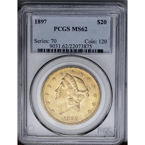 1897 $20 MS62 PCGS. Sharply struck and lustrous, with 1897