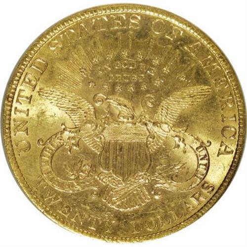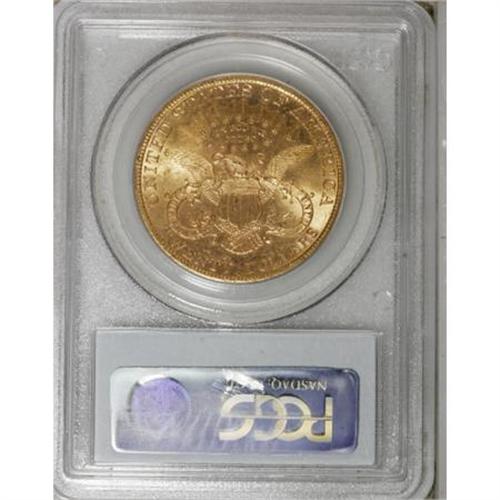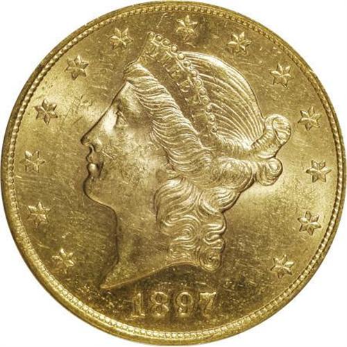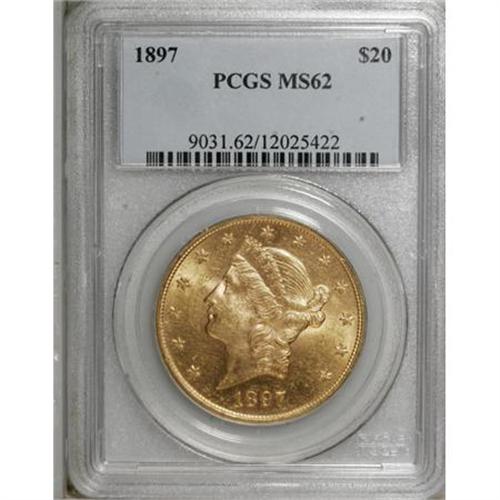 <B>1897 $20 MS62 PCGS.</B></I> PCGS Population (3625/1289). NGC Census: (5522/2440). Mintage: 1,383,261. Numismedia Wsl. Price for NGC/PCGS coin in MS62: $740. (#9031)<BR><BR><B>Coin Engraver:</B> James B. Longacre<BR><BR><b>Shipping:</b> Coins & Currency (<a target="_blank" href="http://www.heritageauctions.com/common/shipping.php">view shipping information</a>)